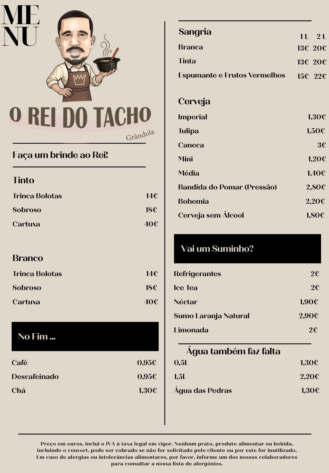 Bem-vindo ao Restaurante "O Rei do Tacho", a sua paragem obrigatória na IC1 em Grândola. Especialistas na autêntica cozinha tradicional portuguesa, servimos o famoso Naco na Pedra, o cremoso Arroz Negro de Choco, Choco Frito e o melhor do Porco Preto. Oferecemos um ambiente acolhedor com esplanada, estacionamento privativo e um menu do dia variado. Com ambiente acolhedor, esplanada e estacionamento próprio, recebe famílias, trabalhadores e turistas que procuram uma experiência gastronómica autêntica, com comida caseira e sabor marcante. Oferece menu do dia à semana, especiais de fim de semana, take-away e eventos tradicionais como bailaricos. Para reservas ou informações, contacte 269 477 200. O Tacho do Rei espera por si!
